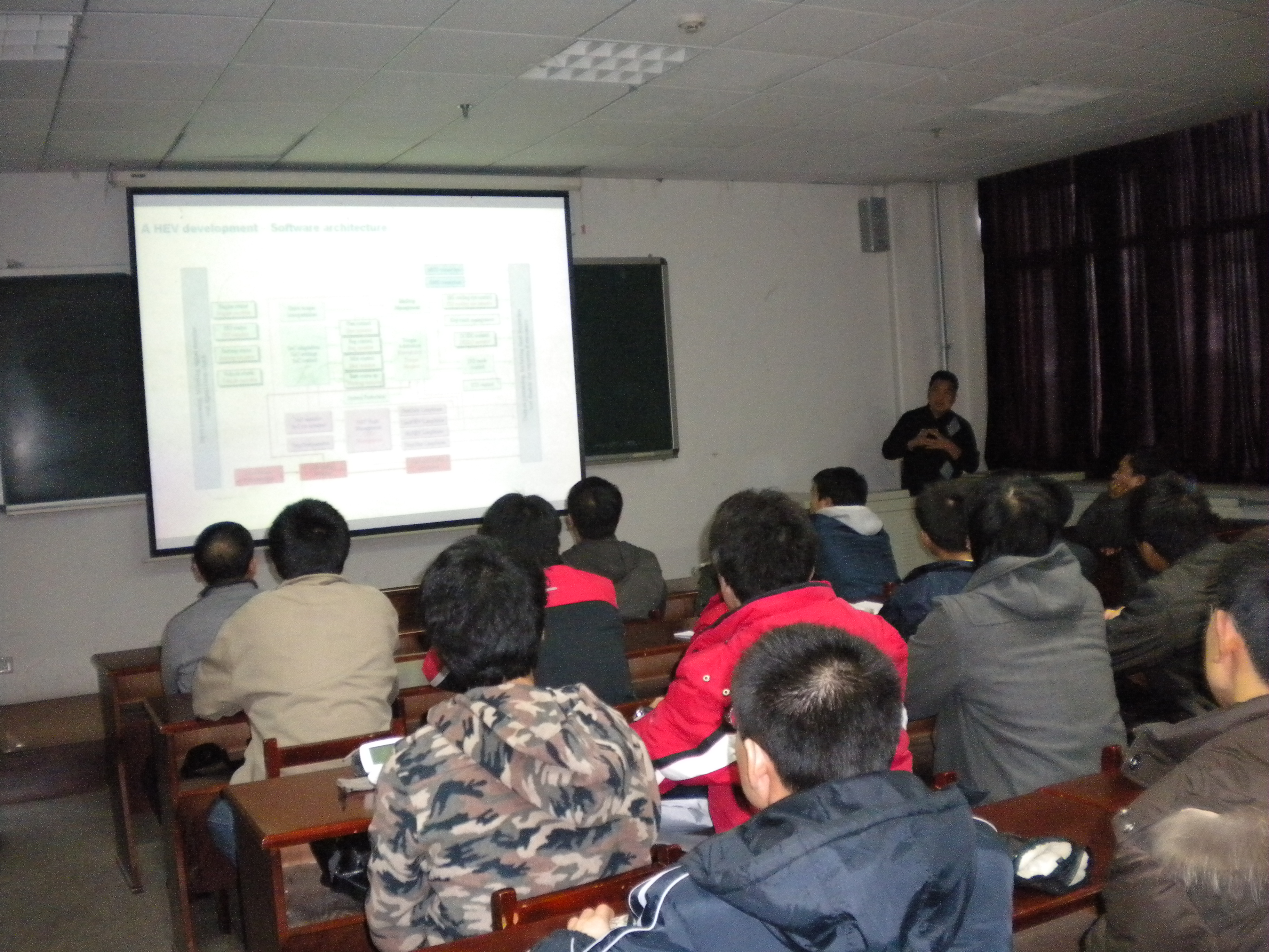 秦老师近日刚从英国拉夫堡大学(Loughborough University)做访问学者归来,并对目前国内外车辆系统能源结构进行了分析和比较,为本次学术报告的奠定了理论基础。在此基础上,秦教授指出制约车辆系统能源结构的两大主要因素,即人们普遍关注的能源问题和环保问题,这也正是本次讲座主题的工程背景。接着讲座的重点自然就引出了,即为车辆系统的混合动力能源结构。随后,秦教授系统地介绍了车辆系统混合动力的级别、形式和特点,并列举大量的工程实例予以详细说明。