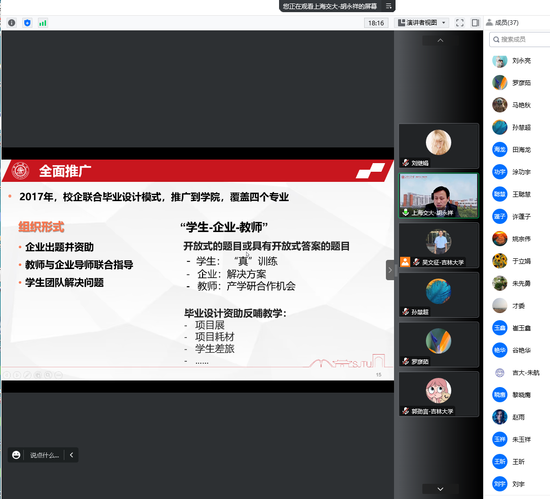 胡永祥教授从新时代人才培养改革、校企合作毕设模式和实施与管理方式三方面做了报告。主要介绍了通过校企联合开展毕业设计的人才培养的模式,在新时代发展下人才培养要与产业变革相适应,通过积极开展交流合作,促进产教融合,不断探索人才培养体系改革;利用宽口径交叉融合课程体系和设计制造系列课程,逐级进阶培养学生解决复杂工程问题的能力;创立项目式教学模式,将实践融入到课程教学中,培养学生的创新思维能力、知识与技术集成能力、交流沟通能力和团队合作能力;引入企业“真问题”,打造产教融合平台,利用校企联合开展毕业设计,解决企业痛点,提升学生的专业热情,培养学生的综合素质。