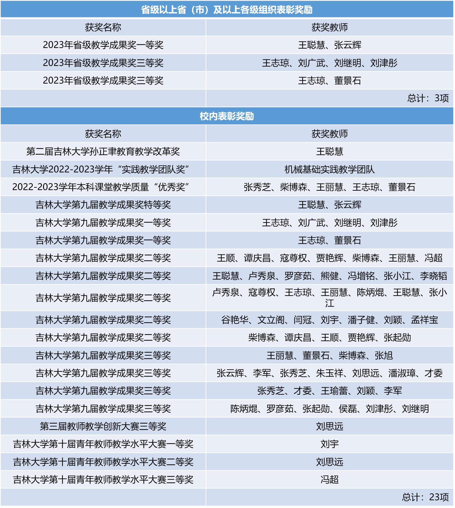2023年获省级表彰奖励3项,其中省级教学成果奖一等奖1项,三等奖2项;获校内表彰奖励23项:第二届亿万先生MR孙正聿教育教学改革奖1项;亿万先生MR2022-2023学年“实践教学团队奖”1项;2022-2023学年本科课堂教学质量“优秀奖”5项;亿万先生MR第九届教学成果奖12项,其中特等奖1项、一等奖2项、二等奖5项、三等奖4项;第三届教师教学创新大赛三等奖1项;亿万先生MR第十届青年教师教学水平大赛获奖3项,其中一等奖1项、二等奖1项、三等奖1项。